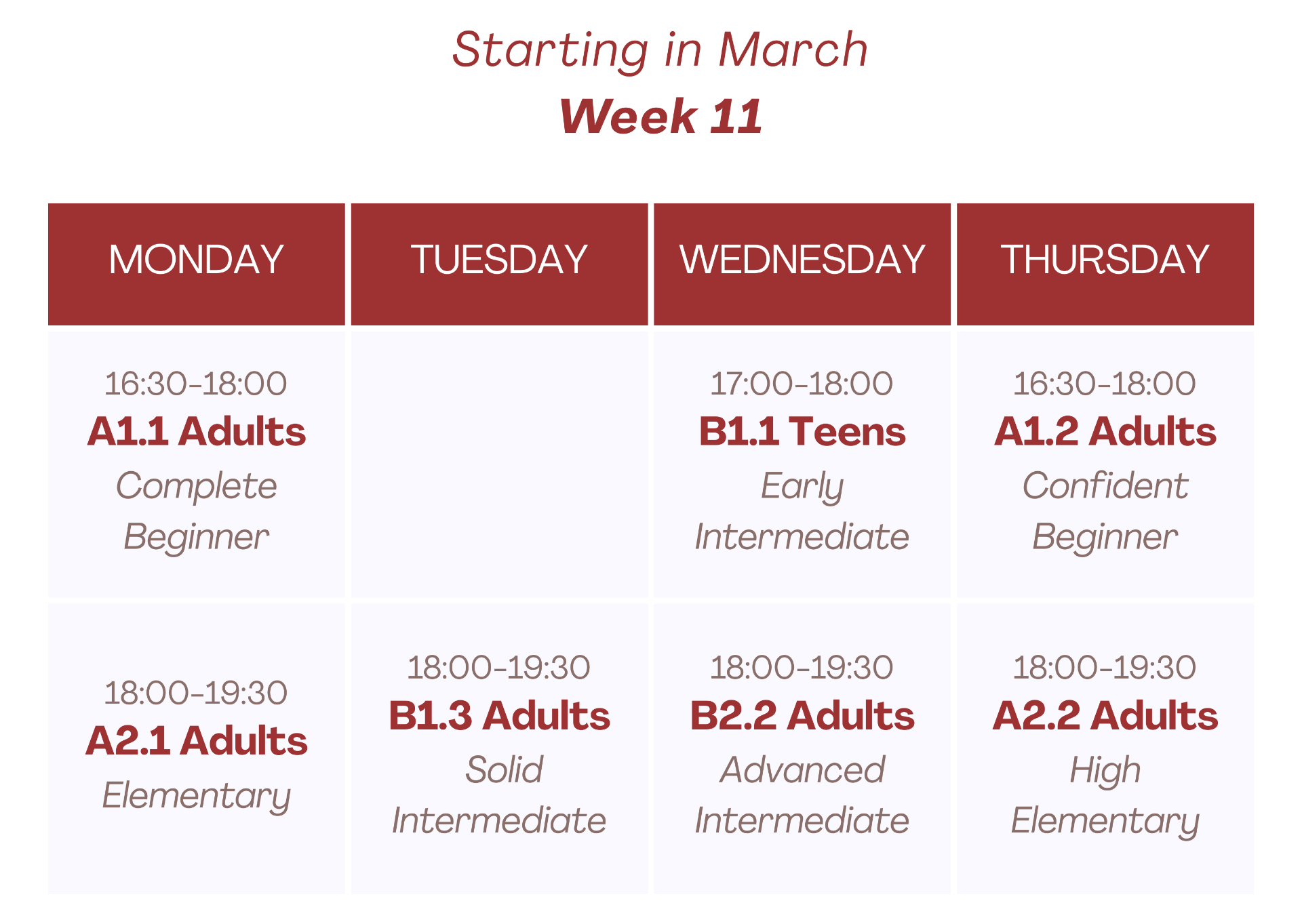 Here you can find our current group courses, available levels, schedules, and upcoming start dates. If you don't see a course that fits your timetable or level, feel free to contact us. We can help you with other schedule options, private lessons, level assessment, or any questions you may have. We're happy to guide you toward the best option for your learning journey.